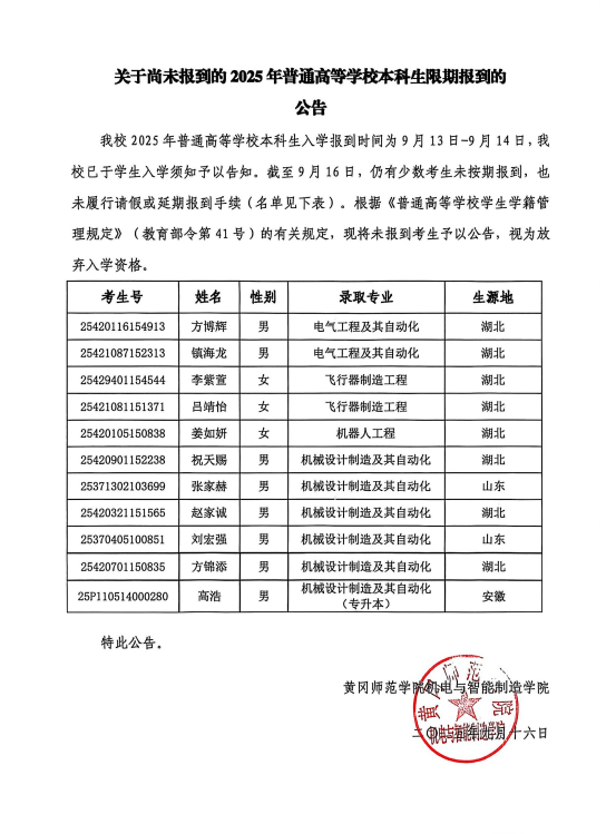 关于尚未报到的2025年普通高等学校本科生限期报到的公告