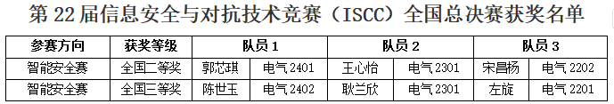 10月25日至26日,第22届信息安全与对抗技术竞赛(ISCC)全国总决赛在云南林业大学圆满落幕。我院2支队伍获全国二等奖1项、三等奖1项。