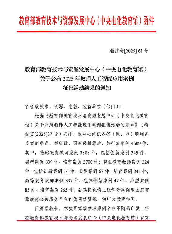 据悉,全国共报送高等教育教师案例397件,包括创新案例47件、典型案例85件、培育案例265件。我院教师首次获评创新案例,全校仅此一项。